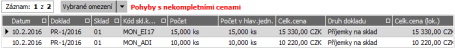 Pokud si je zobrazíme, zjistíme, že se jedná o pohyby na příjemce PR-1/2016, kterou jsme si zadali s nekompletními cenami v kap. Příjem na sklad - tuzemský obchod: