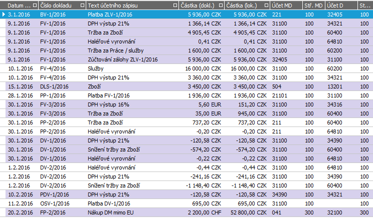 Obdobně si zaúčtujeme ze žádostí např. FV-2/2016, dobropisy vydané DV-1/2016 a DV-2/2016, platbu faktury vydané FV-1/2016 PP-1/2016, platbu zálohového listu ZLV-1/2016 BV-1/2016. Dále zaúčtujeme např. fakturu přijatou FP-2/2016 na nákup majetku a souhrnný dodací list DLS-1/2016 apod. Pro některé záznamy se mohlo stát, že se nám nedoplnily všechny účty rovnou dle předkontace, doplníme je tedy v průběhu účtování ručně. Do jaké míry máte v žádostech účty a to včetně analytik doplněny, závisí jednak na předkontacích a jednak na tom, zda jste zadávali potřebné údaje, z nichž předkontace čerpaní v souladu s naší příručkou (např. typy výdajů a příjmů apod.).