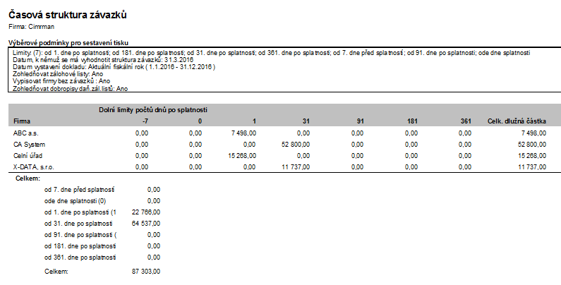 Poté si označíme a vybereme ty limity, po nichž chceme strukturu závazků vypsat, v našem případě si označíme a vybereme všechny dle předchozího obrázku. V omezovacím prvku Datum, ke kterému se má počet dnů po splatnosti spočítat zadáme např. 31.03.2016. Pokud jste doklady zadávali stejně jako my v této příručce, měli byste obdržet výpis obdobný následujícímu: