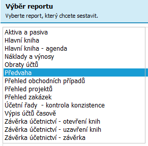 Veškeré přehledy nutné a obvykle pořizované k účetní uzávěrce, jako je např. Předvaha, Rozvaha, Výsledovka apod., naleznete buď v agendě Účetní reporty nebo v agendě Účetní výkazy.