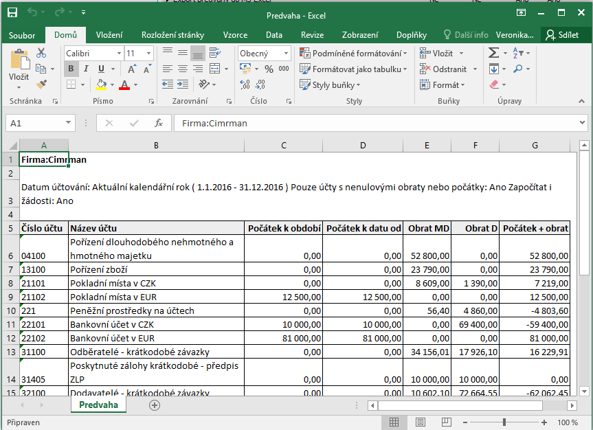 V případě volby Exportovat report systém nabízí export Předvahy do MS Excel. Pro správnou funkčnost exportu musí být MS Excel nainstalován na vašem počítači. V našem příkladu systém zobrazí tabulku v MS Excel podobnou následující: