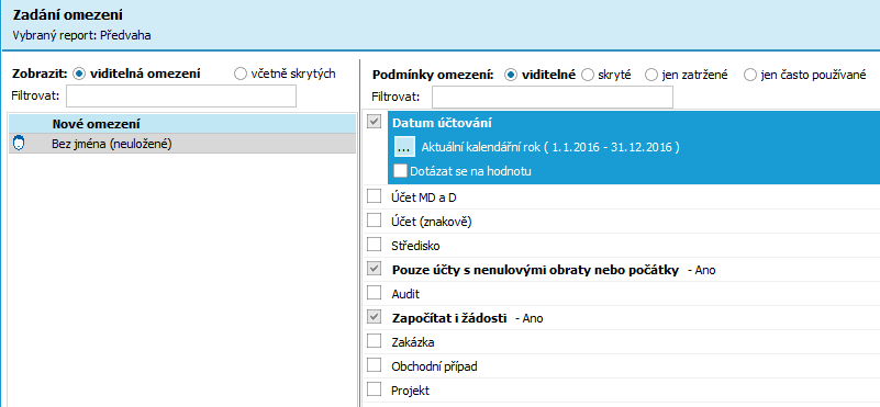 Zvolíme Předvahu a v průvodci zadáme omezení pro výběr účetního období přehledu, níže pak označíme, zda chceme vybrat pouze účty s nenulovými obraty a zda chceme zahrnout i účetní zápisy z agendy Účetních žádostí: