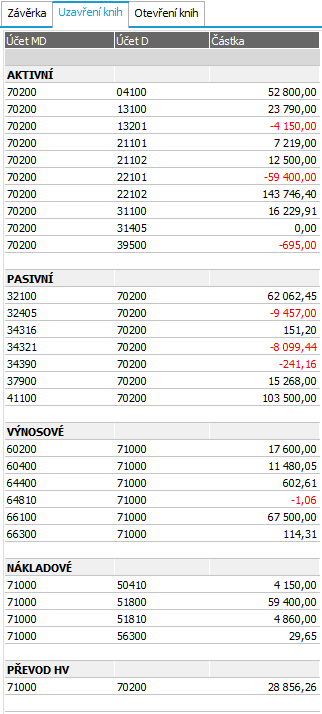 Žádné fyzické zápisy uzavření a otevření knih se neprovádí, pohyby jsou pouze fiktivní s možností tisku. Jak bylo řečeno již dříve, uzávěrka žádná data nemaže, takže jsou k dispozici i pro výpisy za předchozí období apod. Pokud bychom generovali fyzické uzávěrkové pohyby do deníku, připravili bychom se mj. o možnost sledovat obraty na účtech z uzavřených období apod.