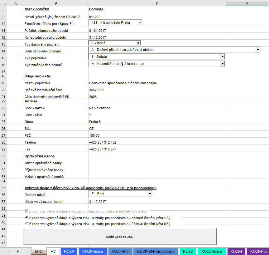 Z Účetních výkazů lze sestavit podklad pro podání Přiznání k dani z příjmu v elektronické formě ve formátu XML ve struktuře požadované Finančním úřadem, který lze načíst v Daňovém portálu Finanční správy. Tento podklad najdeme ve složce EPO, doplníme chybějící údaje a zvolíme Uložit výkaz do XML: