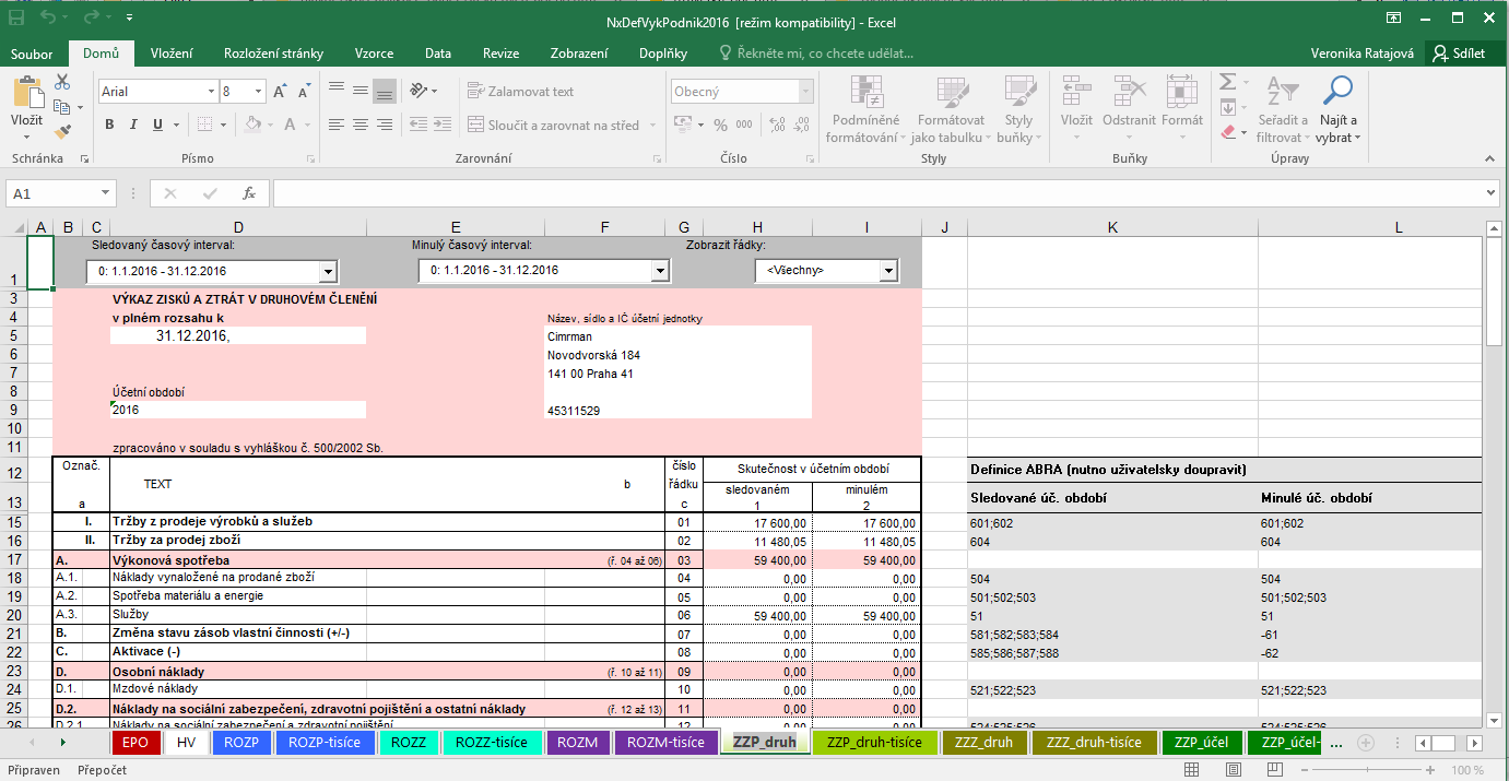 V dolní liště okna se můžeme přepínat mezi jednotlivými výkazy, označení složky ROZP označuje Rozvahu pro podnikatele, Výkaz zisků a ztrát najdeme ve složce ZZP.