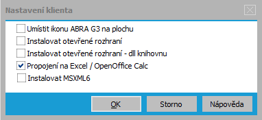 Pokud se otevření účetních výkazů ze systému ABRA Gen nepodaří, vypíše program chybovou hlášku. Při volbě typu výstupu MS Excel nebo Calc je při prvním spuštění často potřeba zkontrolovat v agendě Nastavení klienta správné propojení na příslušný tabulkový kalkulátor: