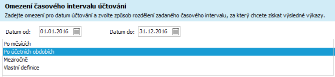 Výběr časového omezení pro napočítání účetních dokladů do výkazů, vybereme rok od 1.1.2016 do 31.12.2016 a např. Po účetních obdobích.