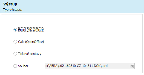 V dalším kroku vybereme typ výstupu, konkrétní tabulkový kalkulátor, tisk přehledu nebo jméno souboru, do kterého systém napočtená data uloží, výkaz z nich lze sestavit pak dodatečně. V našem příkladu vybereme výstup do Excel (MS Office):