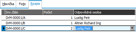 Příklad zadaného drobného majetku, kdy je založena jedna karta pro více kusů a je zadán rozpis odpovědných osob za jednotlivé kusy.