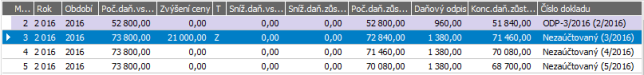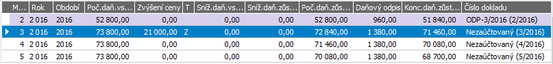 1. Prohlédneme si, jak se změna ceny promítla do odpisů a zůstatkových cen. V agendě Dlouhodobý majetek otevřené vstoupíme do záložky Odpisy subzáložky Daňové odpisy. Promítla se změna ceny jako zvýšení do měsíce 3/2016 následovně?