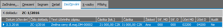 2. Nyní si prohlédneme, jak se změna ceny promítla do účtování. Máte v záložce Zaúčtování právě vystaveného dokladu Změny ceny v agendě Změny vstupní ceny zápis obdobný následujícímu? Tj. změna ceny se promítá na majetkové účty?