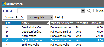Zde zadané druhy směn (a jejich časové údaje) se čerpají z číselníků Druhy směn.