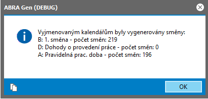 Po ukončení hromadného generování směn v záložce Seznam se zobrazí zpráva s informací, kolik kterých směn bylo vygenerováno.