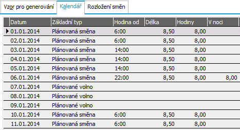 Tj. směny se vygenerovaly dle vzoru: dopolední, dopolední, odpolední, odpolední, odpolední, noční, volno, volno, volno, dopolední atd. Na svátek 1.1. padla plánovaná směna. Pokud bude ve svátek pracovat, bude mu náležet příplatek za práci ve svátek. Pokud nebude ve svátek pracovat, bude mu náležet náhrada za svátek.