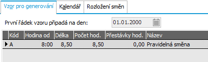 V záložce Detail si prohlédneme záložku Vzor pro generování, kde je udaná sekvence směn tak, jak mají jít za sebou počínaje dnem daným v hlavičce kalendáře. Podle tohoto vzoru se pro zadané období generují konkrétní směny na konkrétní dny kalendářního roku. Pro pravidelnou pracovní dobu je zde pouze jeden druh směn: