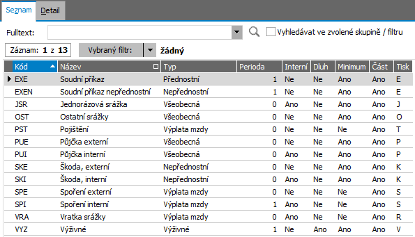 Číselník druhů srážek, srážky mohou být přednostní, nepřednostní, typu výživného, všeobecné, Interní, externí. U každého druhu srážky se určuje priorita srážky, zda zohlednit nezabavitelné minimum, zda lze srazit část požadované částky a zda srážet z i příjmů z dohod.