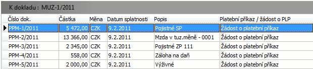 Otevřeme agendu Provedené mzdové uzávěrky. Viz modul Mzdy a personalistika→záložka Uzávěrky, zúčtování. Provedeme dotaz bez omezení. V seznamu bychom měli mít jeden uzávěrkový doklad MUZ-1/2011. Uzávěrkové doklady jsou jakési fiktivní doklady, které obsahují sadu podkladů pro vytvoření žádostí o platební příkazy (a podle nich pak ostrých plateb. příkazů), které se vytvořily podle definic uzávěrky (v agendě Definice uzávěrky), u nichž je nastaveno Vypočítat podklady pro žádosti o platební příkazy, a podle definic plateb (v agendě Definice plateb).