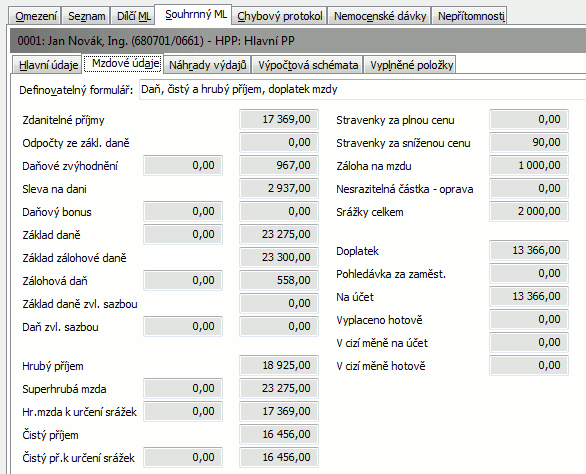 Stejným způsobem si můžeme prohlédnout další vstupní formuláře. V subzáložce Vyplněné položky pak uvidíme najednou všechny spočtené údaje na dílčím mzdovém listu pro daného zaměstnance. Údaje, které jsou společné pro všechny případné pracovní poměry daného zaměstnance, jsou pak k dispozici na záložce Souhrnný ML: