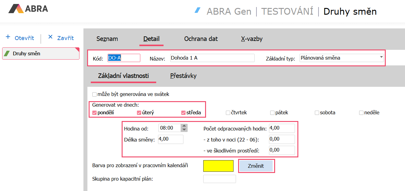 Dále pak zatrhneme, ve které dny se může daná směna generovat. Dle zadání tohoto příkladu zatrhneme dny pondělí, úterý a středa. Dále pak zvolíme začátek pracovní doby do položky Hodina od, Počet odpracovaných hodin, Délku směny a pro následné zobrazení vygenerovaných směn v pracovním kalendáři si zvolíme barvu této směny pro vizuální barevné rozlišení.