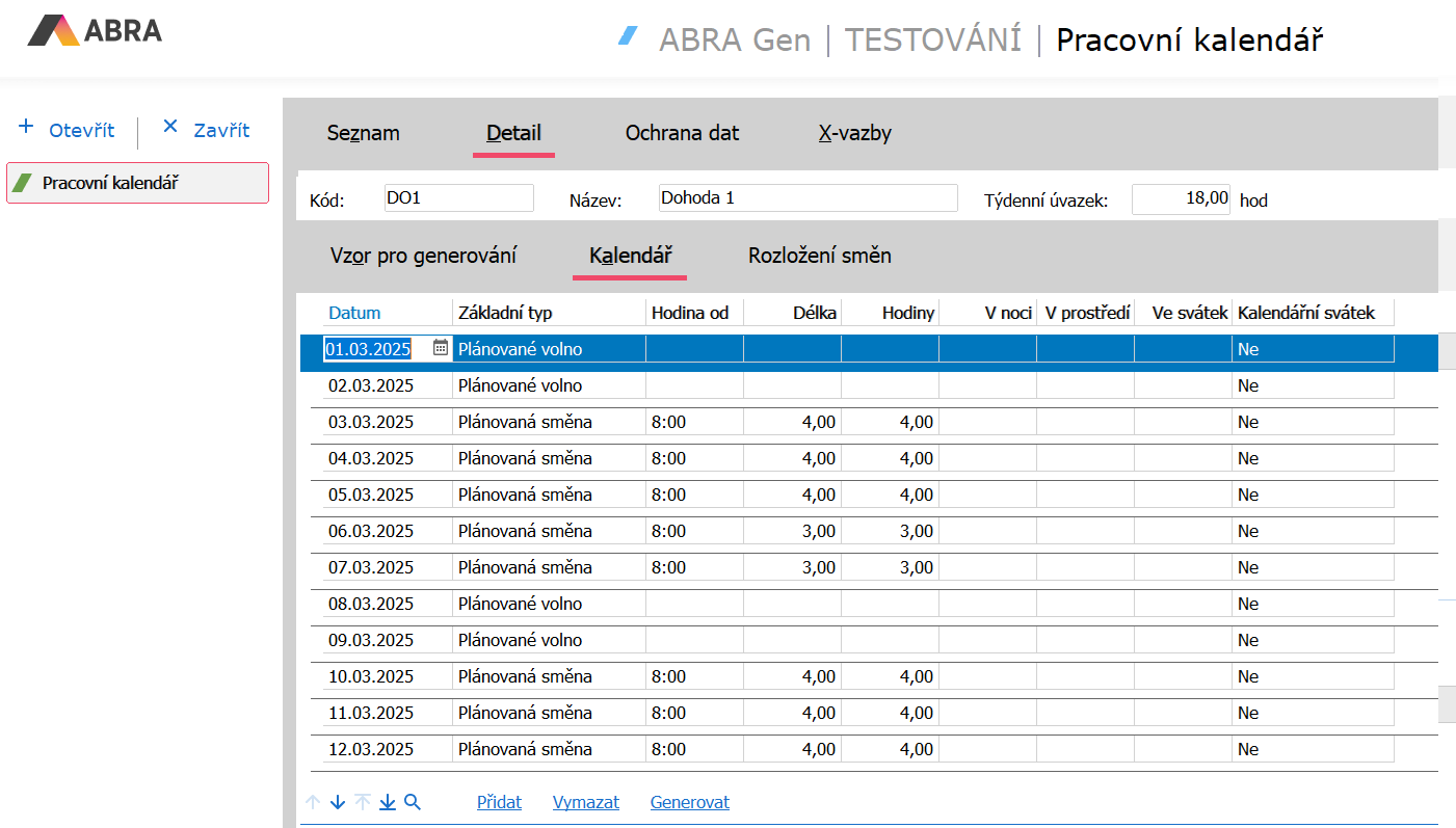 V tomto návodu si ukážeme, jak v systému ABRA Gen pracovat s agendou Pracovní kalendář. V této agendě se nastavují pracovní kalendáře s plánovanými směnami pro různé typy úvazků, zaměstnance s individuálním pracovním rozvrhem apod. Naplánované směny pak využívá systém např. při výpočtu pracovního fondu, nepřítomností nebo dovolených.