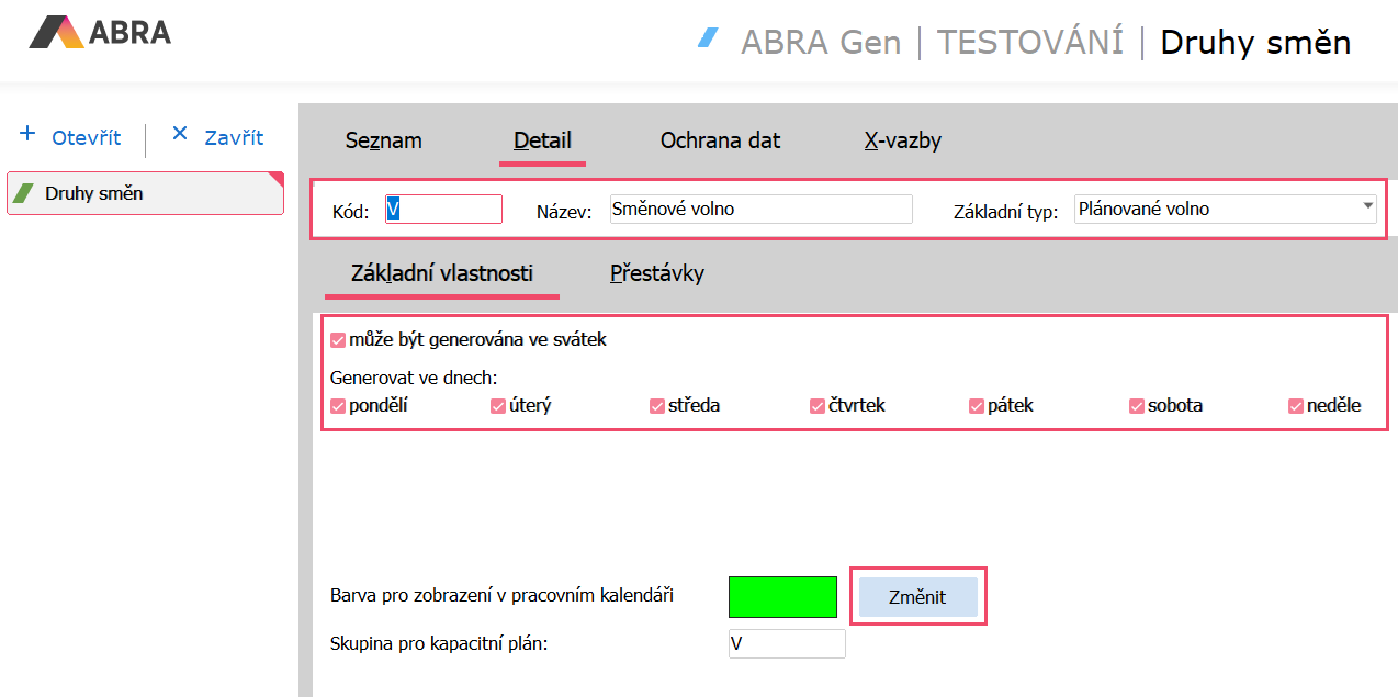 Jelikož je nutné sestavit úplný vzor plánu směn, a to včetně směnového volna, musíme dvakrát přidat druh směny V (Směnové volno). Pokud ji ještě v agendě Druhy směn vytvořenou nemáme, vytvoříme ji následujícím způsobem: