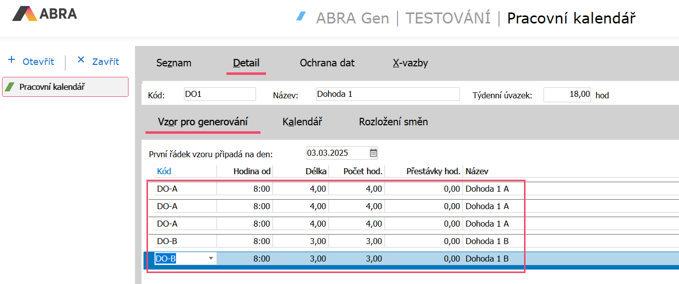 V našem případě jsme zvolili první řádek vzoru na pondělí. Vytvořený vzor pro generování směn bude tedy vypadat takto: