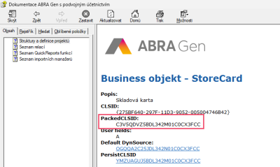CLSID agendy, na které je záložka Parametry. CLSID získáme z technické dokumentace GenDoc.chm, která je umístěna v adresáři s instalovaným systémem ABRA Gen. Zde sekce 0 - Jádro systému a skladové hospodářství, dále pak zvolíme Seznam business objektů a v něm si najdeme objekt s názvem StoreCard. Po rozkliknutí nás zajímá údaj z položky PackedCLSID.