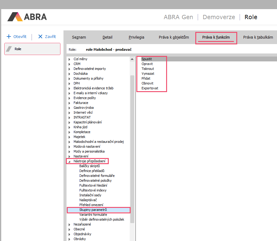 Dále si zkontrolujeme, zda máme nastavena potřebná práva pro práci s agendami Skupiny parametrů a Definice parametrů. Viz agenda Role nebo Skupiny rolí→ záložka Práva k funkcím→volba Nástroje přizpůsobení→Skupiny parametrů.
