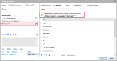 Uložená omezení a filtry obsahující skupinové parametry si hlídají, že všechny položky ze skupinových parametrů existující a jsou k dispozici. Pokud by došlo k vymazání nějakého parametru, bude na to omezení nebo filtr upozorňovat pomocí ikony s vykřičníkem i textově. Chování si ukážeme na příkladu.