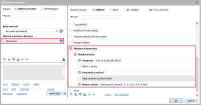 Po přiřazení skupin parametrů k agendám nebo číselníkům se také přidají tyto skupinové parametry do omezení a filtrů.