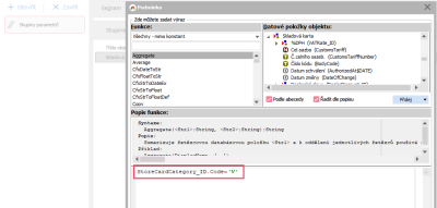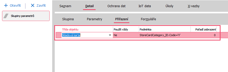 Zobrazení parametrů na záložce Parametry nebudeme chtít vždy, ale pouze v případě, že jsou skladové karty typu Výrobky. To nastavíme v poli Podmínka, kde vytvoříme jednoduchou podmínku StoreCardCategory_ID.Code='V'.
