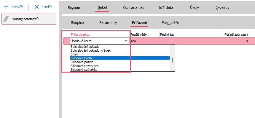 Na subzáložce Přiřazení provedeme výběr agendy, kde se budou parametry zobrazovat. My nastavíme třídu Skladová karta. Mohli bychom přidat i více agend, pro tento případ nám však bude stačit tato jedna.