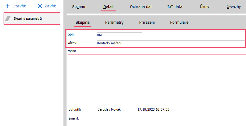 Otevřeme agendu Skupiny parametrů. Nejprve si založíme novou skupinu. Vyplníme kód a název.