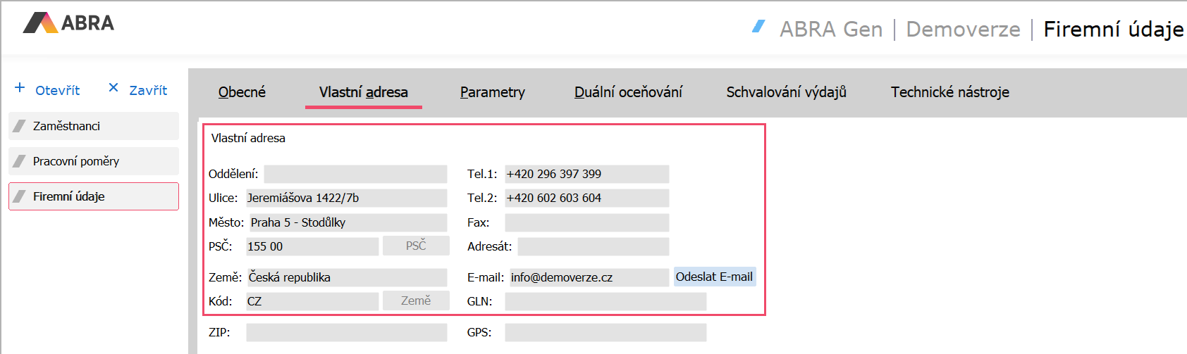 Položky k vyplnění v agendě Firemní údaje na záložce Vlastní adresa: