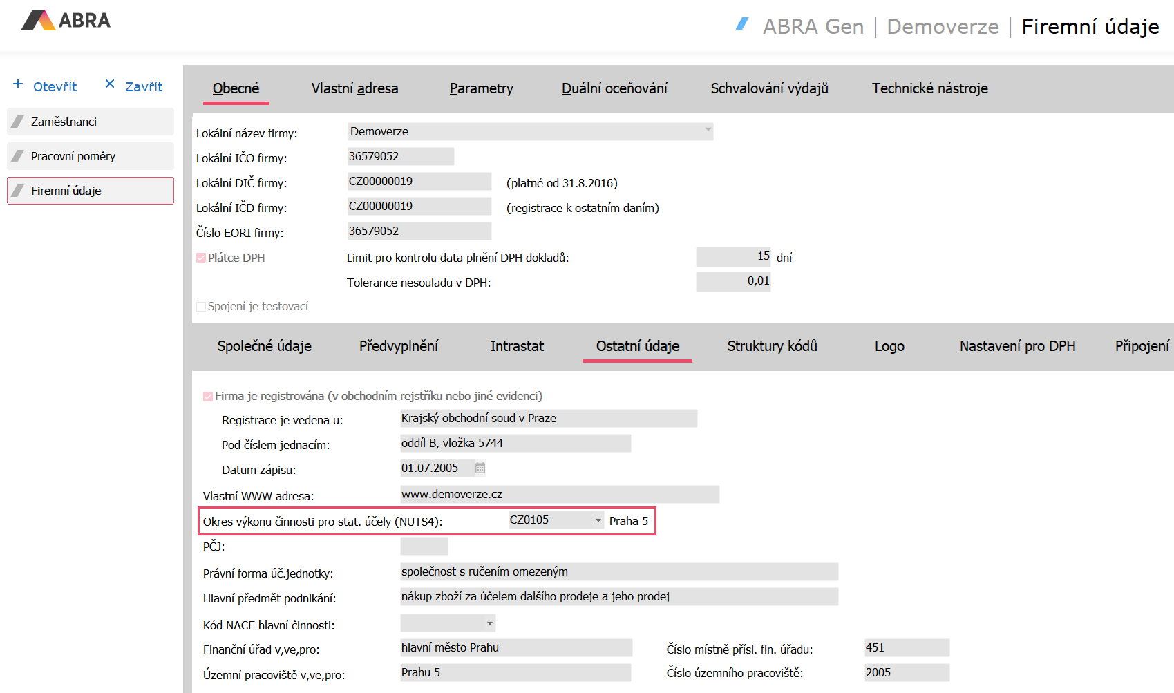 Položky k vyplnění v agendě Firemní údaje na záložce Obecné na subzáložce Ostatní údaje: