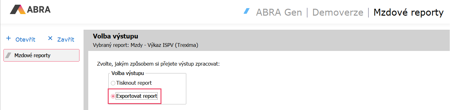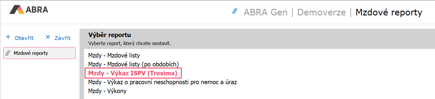 Ke generování exportu využijte v agendě Mzdové reporty a zvolte report "Mzdy - Výkaz ISPV (Trexima)":