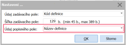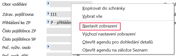 Pro kontrolu, že jste v agendě Zaměstnanci pro daného zaměstnance zvolili správný obor, lze nastavit k položce Obor vzdělání zobrazení názvu definice. To provedete kliknutím pravého tlačítka myši na tuto položku, výběrem volby Nastavení zobrazení a nastavením položky Údaj popisného pole na hodnotu Název definice.