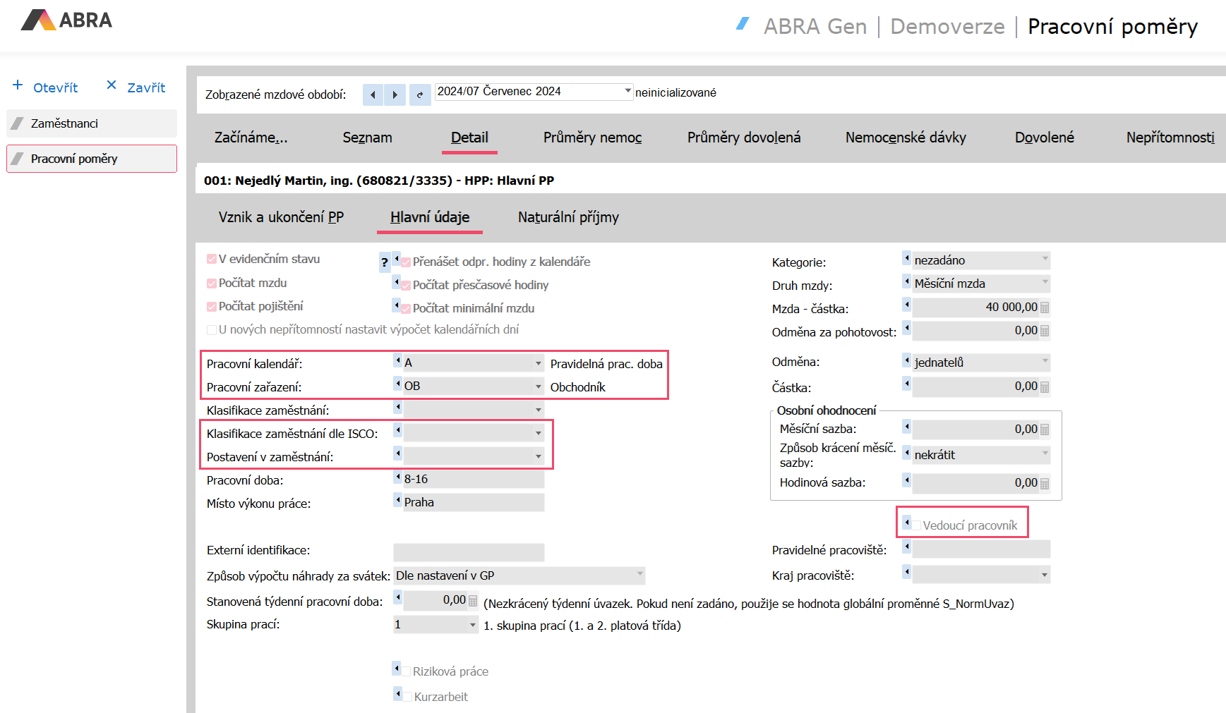 Položky k vyplnění v agendě Pracovní poměry na záložce Detail na subzáložce Hlavní údaje: