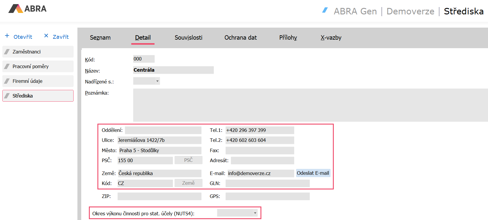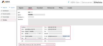 Položky k vyplnění v agendě Střediska na záložce Detail: