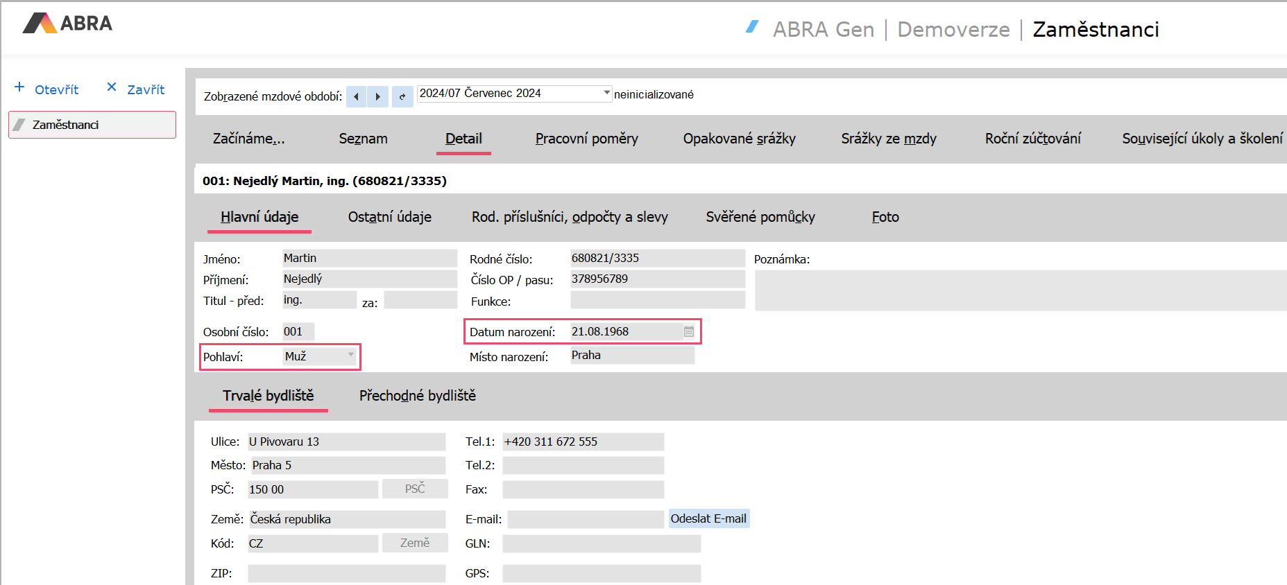 Položky k vyplnění v agendě Zaměstnanci na záložce Detail na subzáložce Hlavní údaje:
