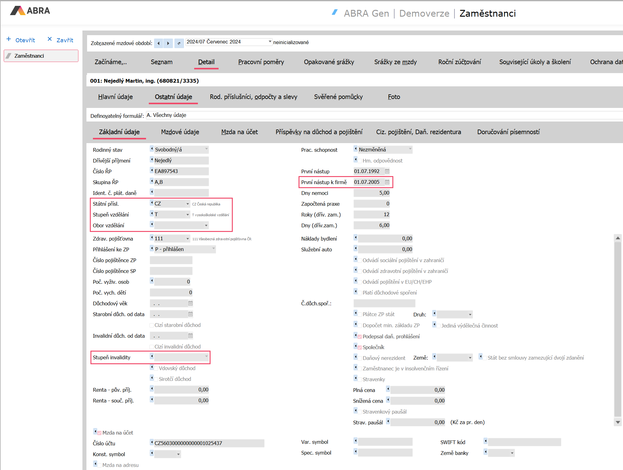 Položky k vyplnění v agendě Zaměstnanci na záložce Detail na subzáložce Ostatní údaje, def. formulář Základní údaje: