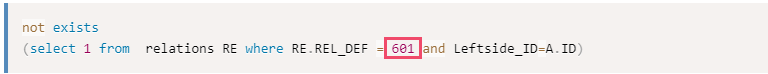(select 1 from relations RE where RE.REL_DEF = 601 and Leftside_ID=A.ID)