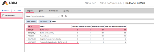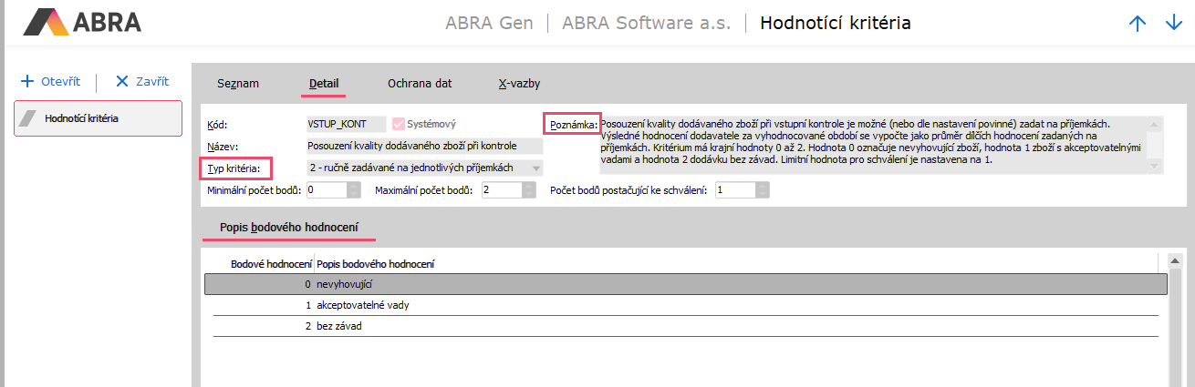 Některá kritéria jsou dodávána výrobcem. V záložce Detail viz údaje kritéria (především typ, frekvence hodnocení a popis kritéria):