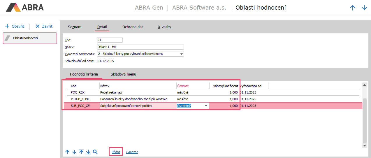 Takto můžeme zadat i další dodavatele pro jednotlivé oblasti hodnocení: