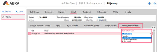 2. Hodnocení na dokladech (kritérium typu 2 - ručně zadávané na jednotlivých příjemkách)