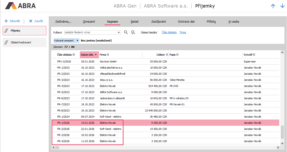 Takto zadáme několik podobných příjemek. Budeme hodnotit např. první kvartál roku 2020. Tudíž data příjemek budou leden až březen.