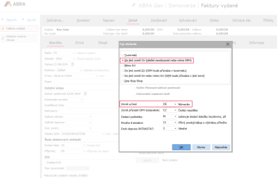 Prvním krokem je na dokladu Faktura vydaná nastavit správný typ obchodu. Zvolíme tedy na záložce Detail na subzáložce Hlavička požadovaný typ obchodu "Do jiné země EU (plnění osvobozené nebo mimo DPH)" (typ 2) a zadáme zemi příjemce Německo. Ostatní položky dokladu vyplníme dle potřeby.