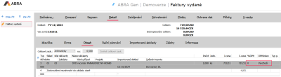 Může se stát, že odběrateli potřebujeme zaslat fakturu, která obsahuje jeden řádek se zbožím s režimem přenesení daňové povinnosti a jeden řádek ve standardním režimu s DPH. Zadání dokladu do systému ABRA Gen by pak vypadalo následujícím způsobem, tedy pro jeden řádek by byl nastaven režim DPH s hodnotou 1 - Přenesení (PDP) a druhý s hodnotou 0 - S daní (DPH):