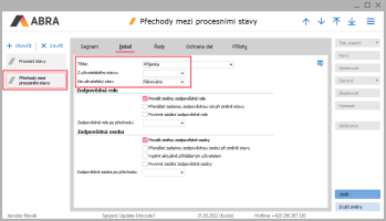 Podobně uděláme následující přechod, ale tentokrát vybereme do položky Z uživatelského stavu hodnoty Ke kontrole. Do položky Na uživatelský stav vybereme Vyřízeno.