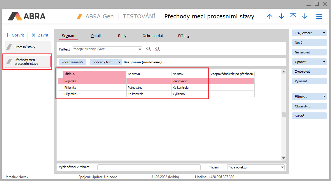 Otevřeme si agendu Přechody mezi procesními stavy. Ta je zatím prázdná. Chceme, aby příjemka po vytvoření měla stav Plánováno, pak přešla do stavu Ke kontrole a pak skončila ve stavu Vyřízeno.